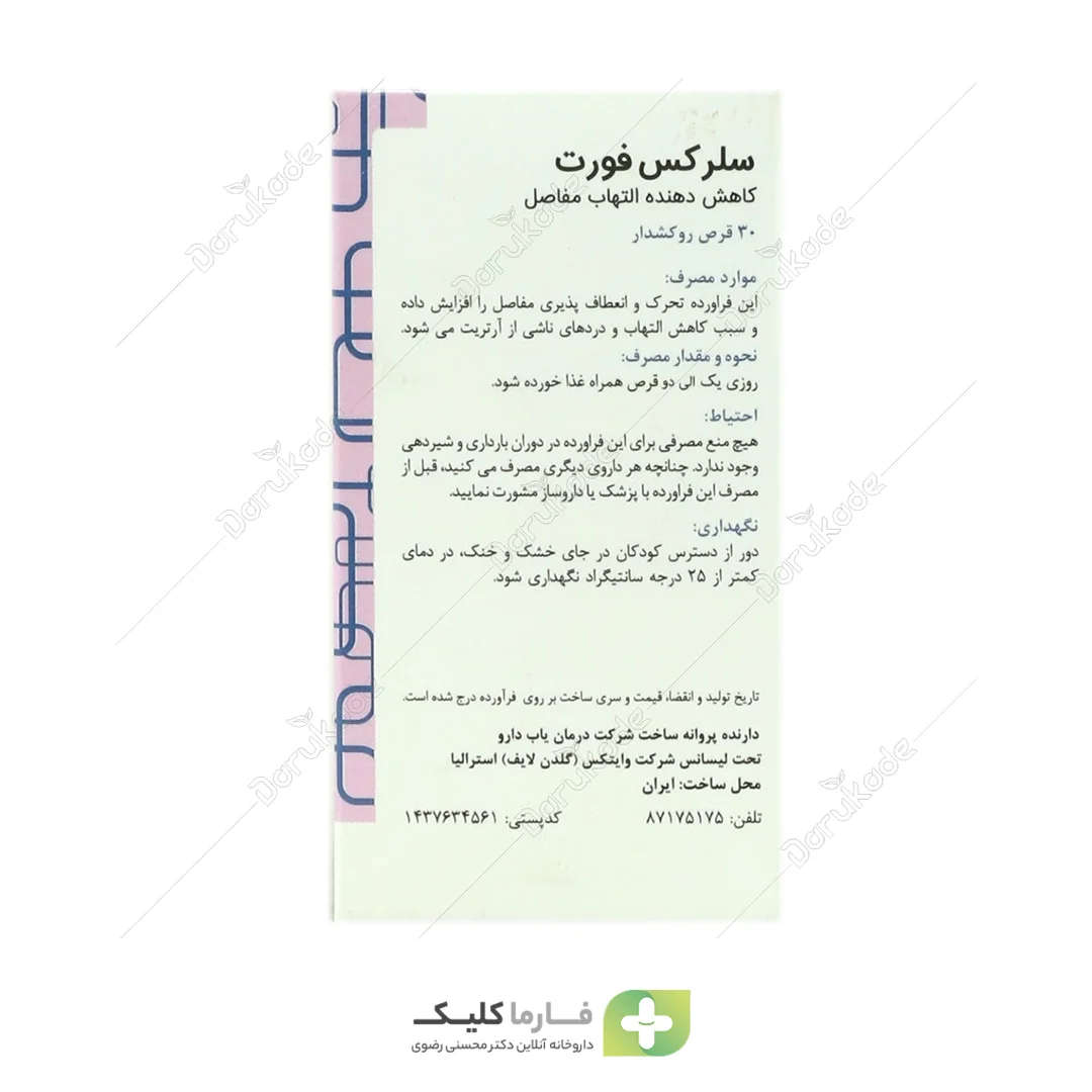 این فرآورده بهصورت قرص و در بستهبندی 30 عددی عرضه میشود و برای افرادی که از مشکلات مفصلی مانند آرتروز، روماتیسم یا نقرس رنج میبرند، انتخابی طبیعی و مؤثر به شمار میرود. قرص سلرکس فورت به دلیل ترکیبات گیاهی خود عوارض جانبی کمی دارد و میتواند به عنوان بخشی از برنامه مراقبت روزانه مفاصل مورد استفاده قرار گیرد.