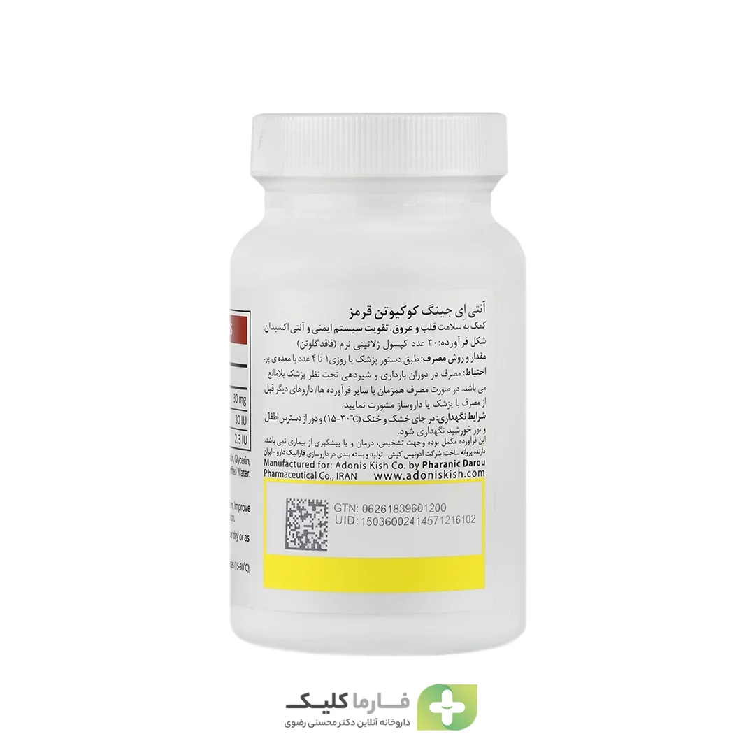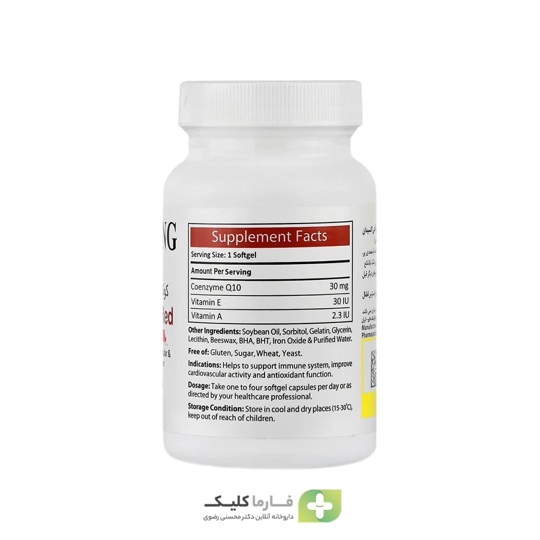 ● حاوی 30 میلیگرم کوآنزیم Q10، ویتامین E و ویتامین A در هر کپسول