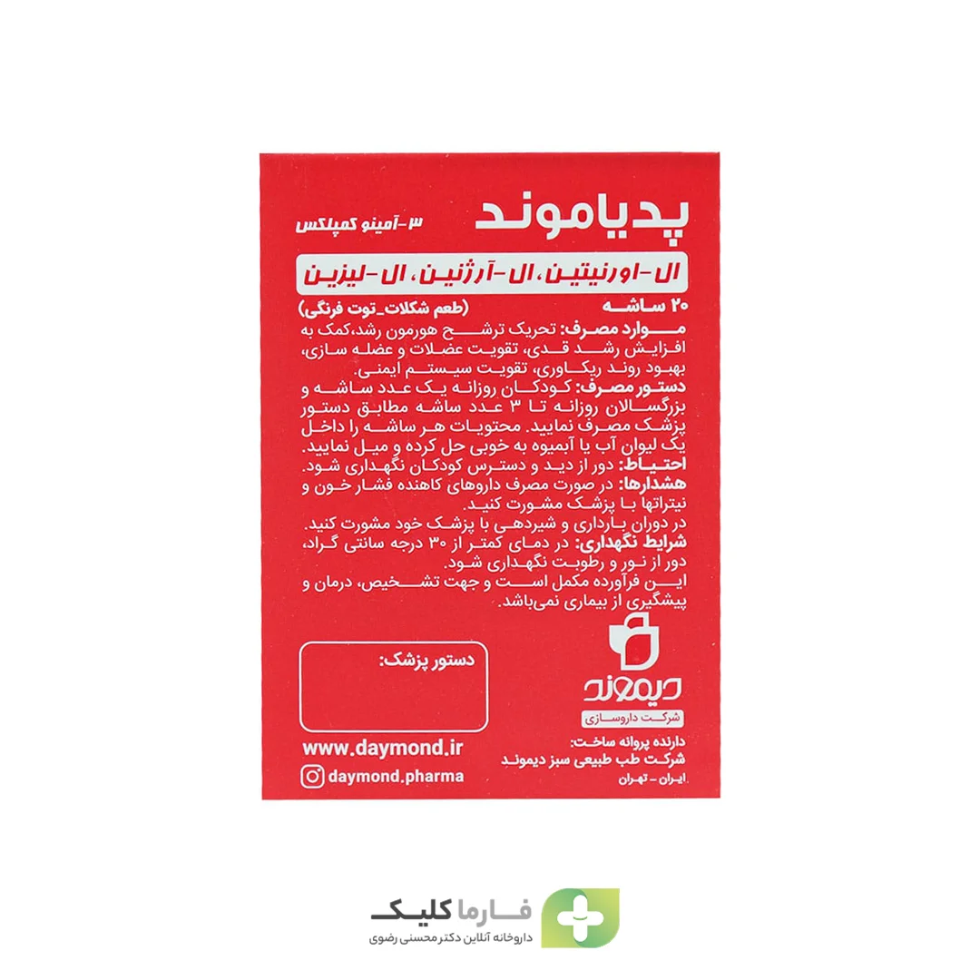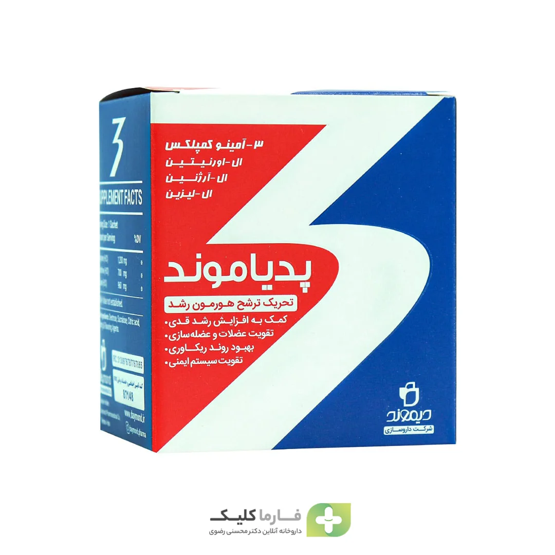 ساشه پدیاموند دیموند یک مکمل رشد و تقویتی مؤثر برای کودکان، نوجوانان و ورزشکاران است که با ترکیب سه اسید آمینه کلیدی یعنی الآرژنین، الاورنیتین و اللیزین طراحی شده است. این ترکیبات نقش مهمی در تحریک ترشح طبیعی هورمون رشد (GH)، افزایش رشد قدی و تقویت عضلهسازی دارند.