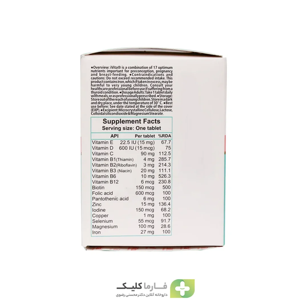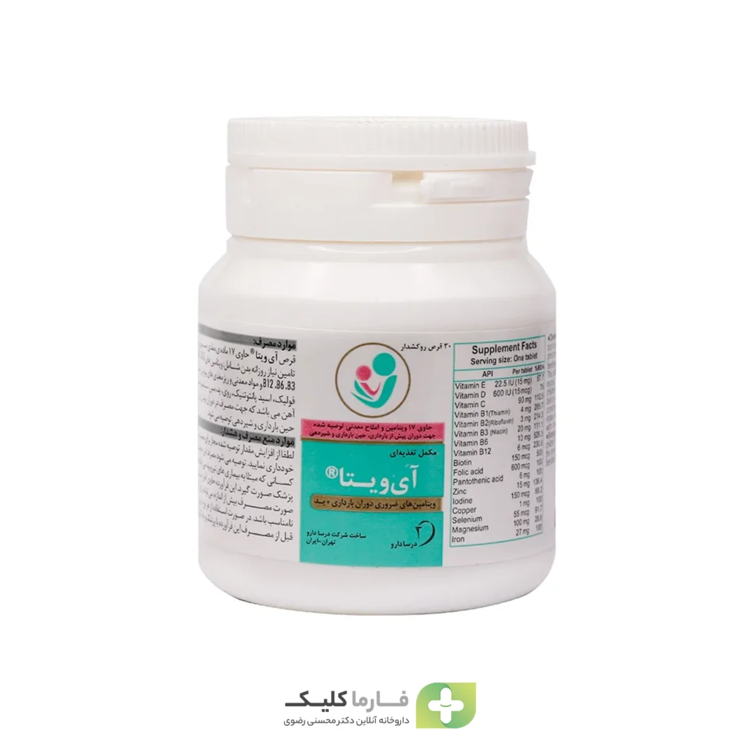 فولیک اسید موجود در قرص آی ویتا، از بروز نقص لوله عصبی (NTD) در جنین پیشگیری میکند، در حالی که آهن به پیشگیری از کمخونی و افزایش انرژی بدن کمک مینماید. همچنین وجود ویتامین D در این مکمل به سلامت استخوانها و سیستم ایمنی بدن مادر و جنین کمک کرده و ید نیز برای عملکرد صحیح غده تیروئید و رشد مغز جنین ضروری است.قرص آی ویتا درسا دارو گزینهای مناسب برای بانوانی است که به دنبال مکملی کامل جهت تأمین ریزمغذیهای مورد نیاز دوران بارداری و شیردهی هستند. مصرف روزانه این مکمل میتواند در بهبود سلامت عمومی مادر، رشد بهینه جنین و تقویت سیستم عصبی تأثیر قابلتوجهی داشته باشد.