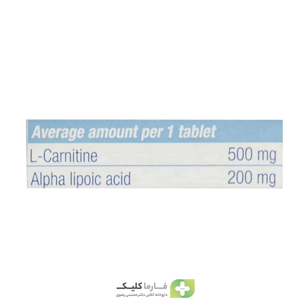 • حاوی 500 میلی‌گرم ال‌کارنیتین و 200 میلی‌گرم آلفا لیپوئیک اسید (ALA) در هر قرص