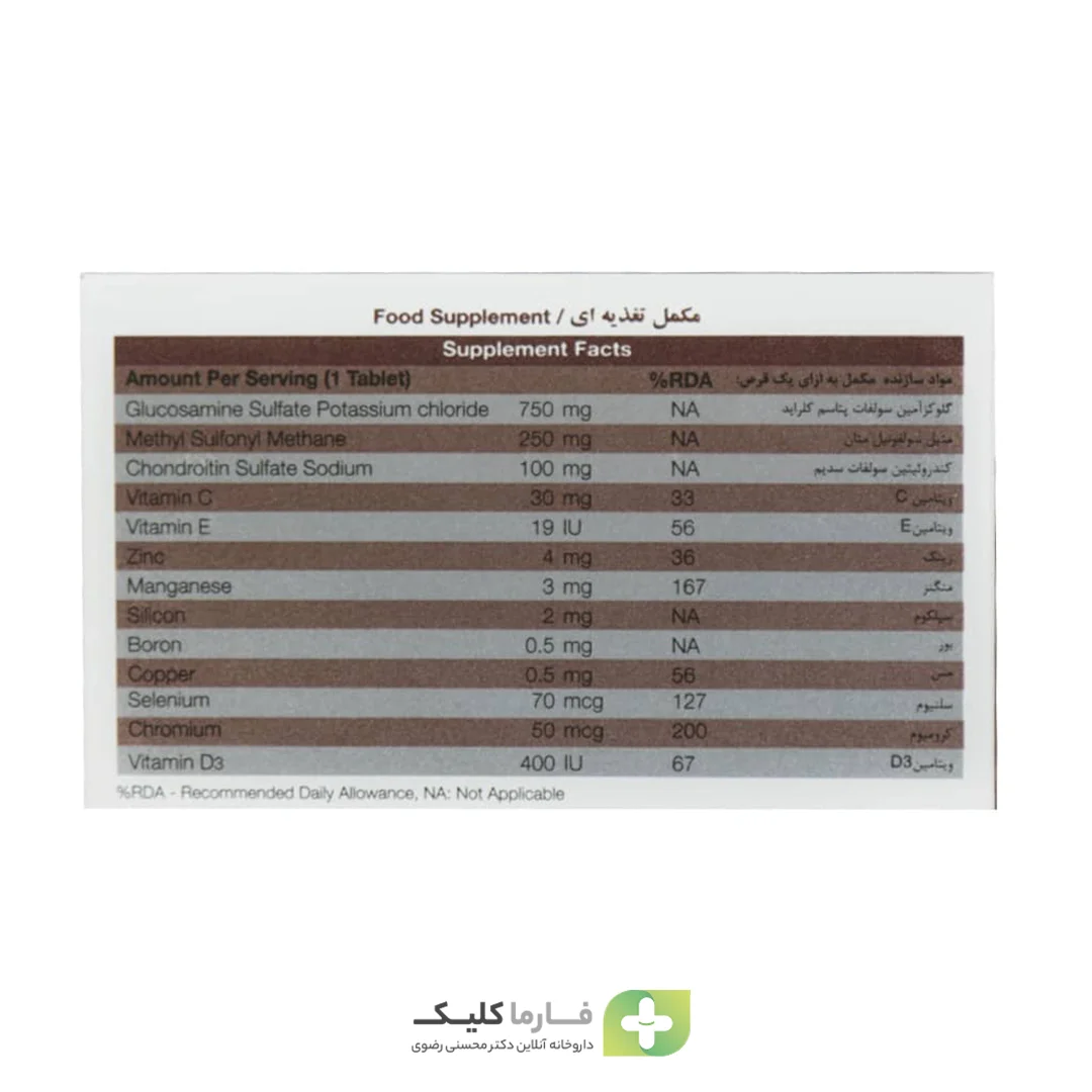 گلوکزامین موجود در این مکمل در بیوسنتز گلیکوزآمینوگلیکانها، هیالورونات و پروتئوگلیکانها نقش دارد و باعث تشکیل کلاژن، محافظت از غضروف و کاهش درد مفاصل میشود. کندرویتین سولفات به حفظ ماتریکس خارج سلولی غضروف کمک کرده و اثرات محافظتی بر غضروفها دارد. ترکیب گلوکزامین و کندرویتین از پیشرفت استئوآرتریت جلوگیری میکند. ام اس ام موجب افزایش انعطافپذیری، سنتز غضروف و کاهش التهاب میشود و ویتامین D3 نقش حیاتی در تنظیم کلسیم و فسفر برای سلامت استخوانها ایفا میکند.