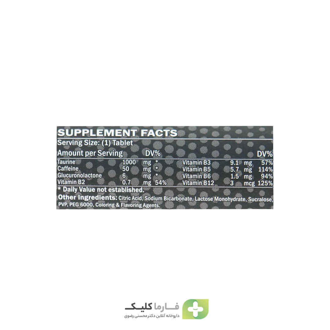 • حاوی کافئین، تائورین، گلوکورونولاکتون و ویتامینهای گروه B برای افزایش انرژی و تمرکز