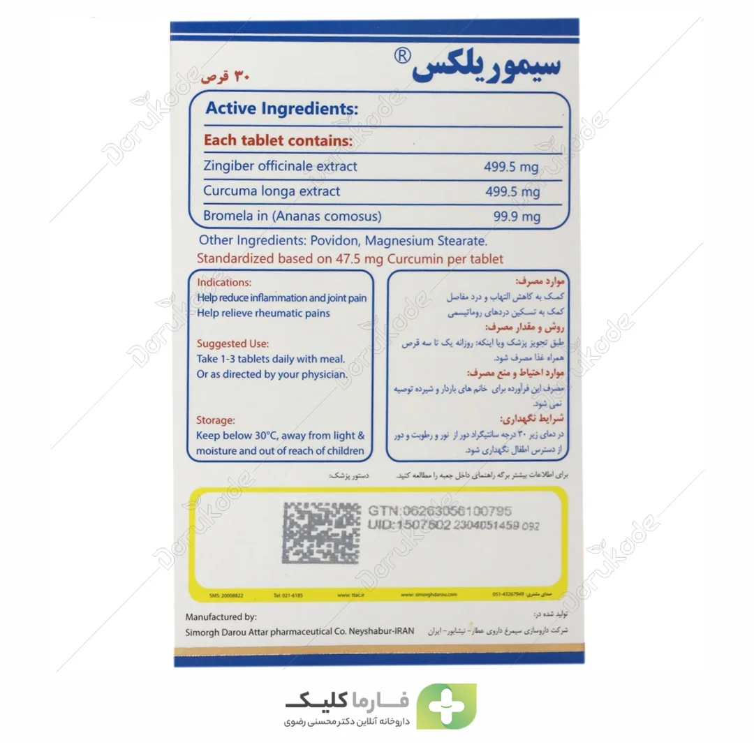 قرص سیموریلکس یک مکمل گیاهی ۱۰۰٪ طبیعی برای سلامت مفاصل و کاهش درد و التهاب است که از ترکیبات مؤثر زنجبیل، زردچوبه و بروملین ساخته شده است. این فرآورده به فرم قرص توسط شرکت داروسازی سیمرغ دارو عطار تولید شده و در بستهبندی ۳۰ عددی عرضه میشود. قرص سیموریلکس با اثرات ضدالتهابی و ضد دردی خود میتواند به کاهش سفتی و محدودیت حرکتی مفاصل، بهبود انعطافپذیری و تسکین دردهای آرتروز کمک کند.